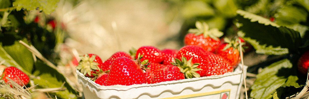 Von Ende Mai bis Ende Juli können Sie auf unseren Feldern Erdbeeren und Himbeeren pflücken.