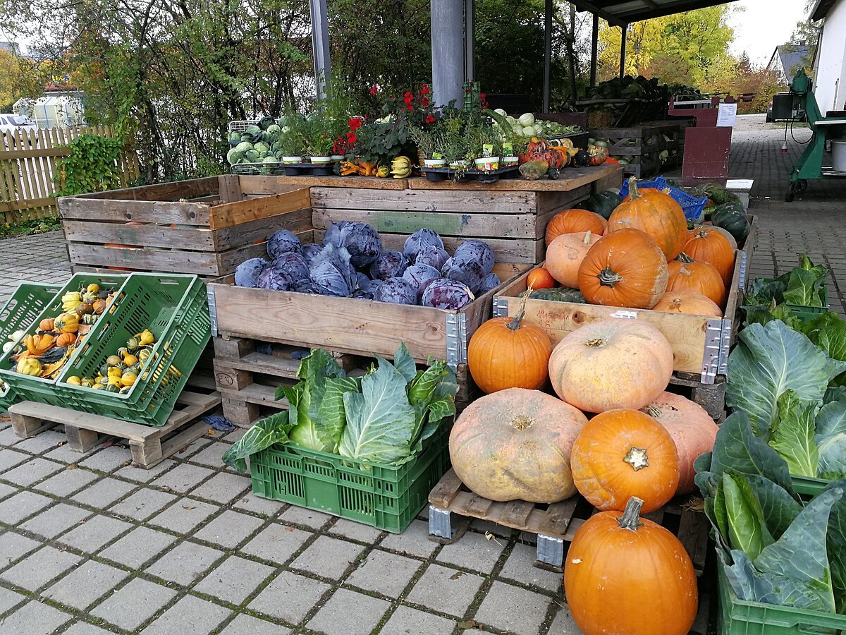 Auf einem Steinpflaster stehen drei große Holzkisten, eine gefüllt mit Kürbissen, daneben Blaukrautköpfe und wieder großen orange Kürbisse. Davor, z. Teil angelehnt befinden sich kleine grüne Kisten mit Zierkürbissen und grünem Spitzkohl. Im Hintergrund in Brusthöhe befinden sich verschiedene Pflanzen in Blumentöpfen und Kohlrabi.